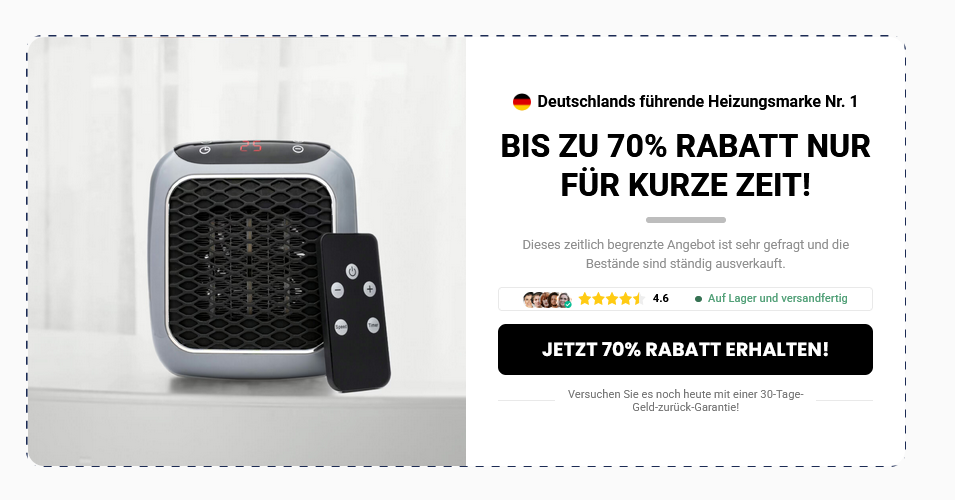 WellHeater ist ein Heizgerät für den privaten Gebrauch in Wohnhäusern. Die Leistung kann je nach Raumgröße, Dämmung und lokalem Klima variieren. Beachten Sie vor der Inbetriebnahme stets die Sicherheits- und Bedienungshinweise des Herstellers. Die in diesem Artikel genannten Preise und Rabatte sind zum Zeitpunkt der Veröffentlichung korrekt, können sich jedoch ohne Vorankündigung ändern. Aktuelle Angebote finden Sie auf der offiziellen WellHeater-Website. Dieser Artikel enthält Affiliate-Links. Wenn Sie über diese Links einkaufen, erhält WellHeater möglicherweise eine Provision, ohne dass Ihnen dadurch zusätzliche Kosten entstehen.