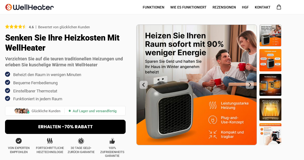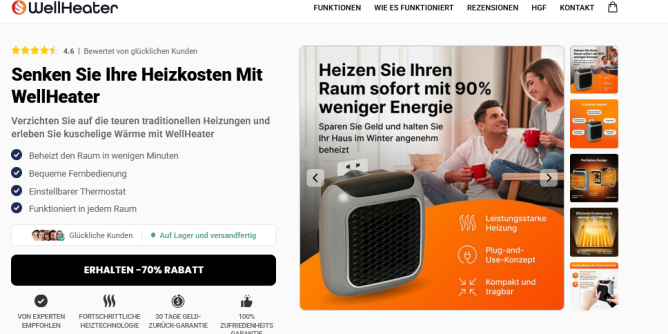 WellHeater ist ein tragbarer, elektrisch betriebener Heizlüfter mit Keramik-Heiztechnologie, der für Räume bis zu 12 Quadratmeter geeignet ist. Das Gerät verfügt über eine Fernbedienung, einstellbare Thermostateinstellungen und Sicherheitsfunktionen wie einen automatischen Überhitzungsschutz. Laut Kundenbewertungen erwärmt WellHeater kleine bis mittelgroße Räume in etwa 5 Minuten. Der Heizlüfter ist über die offizielle Website get-wellheater.com erhältlich und bietet ein 30-tägiges Rückgaberecht sowie 2 Jahre Garantie.